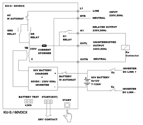 In addition to the main uninterrupted output OUTL, there is a time-delayed output K1.